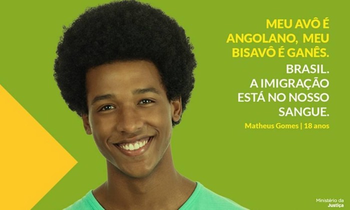 No primeiro momento lançaram um cartaz com um garoto negro muito bonito, Matheus Gomes, com os seguintes dizeres: “meu avô é angolano, meu bisavô é ganês. Brasil, a imigração está no nosso sangue”.